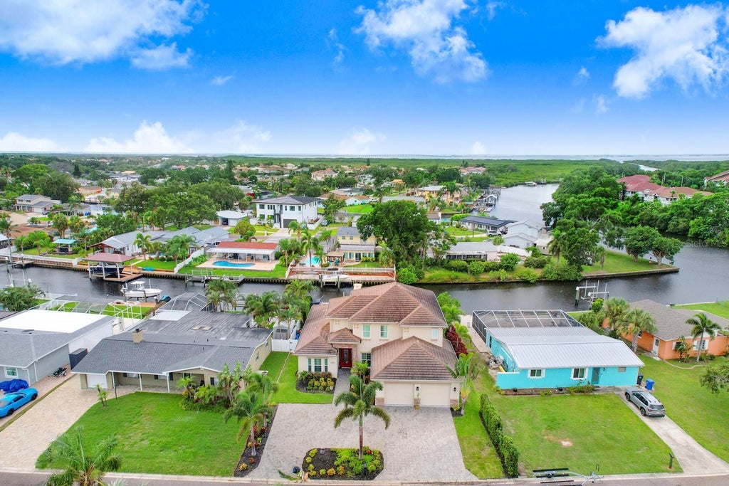 Presenting a boater’s paradise... literally minutes to the open Bay! Spectacular luxurious living! Two-story home perfectly combines luxury, style and functionality. Quality custom built in 2016, beautifully updated and offering nearly 3,300 sq ft of extravagant living. Canal front, lushly landscaped, grand pool home with 4 bedrooms, 4.5 baths and an oversized 2 car garage elevated with an extended brick-paver circular driveway and stone-wrapped front accents. Endless upgrades include solid designer interior doors, upgraded base & custom trim, plantation shutters, custom closet systems in each bedroom & all-important impact windows. Leaded glass entry brings you to soaring ceilings with transom windows providing natural light onto breath taking designer porcelain tile. Living spaces are open and exquisite with formal dining room upon entry, huge Great Room with designer porcelain tile, a striking accent wall and centered by a built-in electric fireplace. The kitchen is a splendid chef’s kiss… custom cherry cabinetry with 42” uppers, 2 lazy Suzanne’s, pull out butler drawers, raised breakfast bar with designer pendant lighting, granite counters with dual under mount SS sinks, tile backsplash, dry bar and wine rack, large working island, SS appliances including 3 door refrigerator, café style ceran top range, built in microwave and dishwasher along with full wall pantry with custom shelving. Huge laundry room with upper & lower cabinetry, folding area and SS utility sink. The spacious primary sanctuary is conveniently located on the main floor. The suite boasts plank tile flooring, coffered ceilings, sliding glass doors to the lanai, posh ensuite with dual vanities, tower cabinetry, free standing soaker tub, full walk-in frameless shower with designer tile, water closet and 2 amazing, custom walk-in closets. This inviting retreat area also offers a second bath fashioned as a powder room, half bath, boasting a striking designer vanity. An additional bedroom is located at the front of the main floor featuring a walk-in closet and its own ensuite bath with walk-in shower. The striking wood staircase is accented by wrought iron and leads to the spacious 2nd floor loft overlooking the great room and offering endless possibilities. The two additional bedrooms are spacious and have full wall closets. Convenient hallway bath features dual vanities, tower cabinetry, separate water closet, and tub/shower combination. Extend your living and entertaining space to your outdoor waterfront paradise! Pool side kitchen, covered lanai with remote controlled retractable screens, brick-paver pool deck (reset 2025), show stopping, heated pebble tec pool with raised spill over spa and surrounded by lovely vinyl fencing. The homes 4th full bath is true cabana style with a pedestal sink and walk-in shower. Beyond the pool sanctuary is boating nirvana! A brick paver walk leads to a trek deck boat dock that includes a jet ski lift and 10K capacity boat lift (motor replaced 2025). The home is perfectly situated just two houses from Channel A and only a brief 5 minute boat ride to the Bay!!! Notable recent updates include first floor interior & loft painted (2024), new variable speed pool pump (2025). This is an absolute must see! A rare find offering the epitome of luxurious coastal living! Bonus-the Tampa Shores community offers a boat ramp for homeowners! Make your waterfront dream a reality! Schedule a showing today!