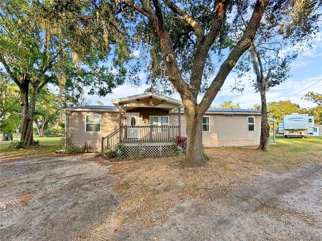 This exceptional, upgraded doublewide home offers over 1500 square feet of living space on nearly 3 acres of land, featuring three bedrooms, two full bathrooms, a private pool, and access to a convenient fishing pond. The interior has been freshly painted and boasts a spacious living room, large family room, and an expansive kitchen designed for functionality and style. The kitchen is a highlight, equipped with stainless steel appliances, granite countertops, above-counter lighting, a center island, and ample room for a dining table. The primary bedroom is sizeable, complete with a private ensuite bathroom, walk-in closet, granite countertops, double vanity and walk-in shower. The second bathroom includes a cultured marble countertop with shower in bathtub, while additional interior amenities include ceiling fans throughout, a water purifier, a water softener, indoor laundry with washer/dryer hookups, all replaced plumbing supply lines and all new ductwork throughout. The outside space presents a true oasis. The above-ground pool, which includes an attached deck and a spacious pool deck encircling it also includes an enclosed canopy lounge area with table and chairs to provide a perfect relaxation spot. The property allows for convenient fishing from the deck into a nearby pond stocked with catfish, pacu, and other fish. The lot offers lots of open yard space for RV use, potential playground space , extra vehicle parking, an additional pond that's full of wildlife and land extends all the way back to Keene Rd. An expansive garage with a workshop and extra storage space, a substantial covered front porch, and delightful landscaping complete the exterior features. The home is conveniently located near local attractions, including the Plant City Strawberry Festival, downtown Tampa, and a leisurely drive to the Tampa Bay Beaches. Be sure sure to schedule your appointment for a unique home showing today!